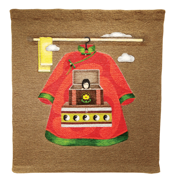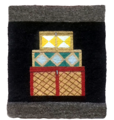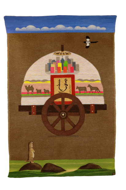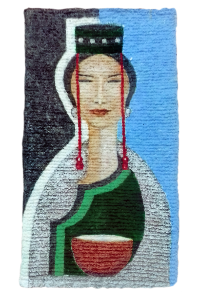 Вообще, эта идея пришла в Катину голову будто и случайно, сама она нигде этому не училась и ничего специально не придумывала. Одно время часто ездила в Монголию и накупила там акриловых красок. По профессии она не художник, просто осваивала в молодости специальность чеканщика по серебру в Бурятии, сейчас это учебное заведение называется «Иволгинский колледж традиционных искусств». Была в самом первом потоке. В качестве дипломной работы делала бурятскую посуду. А диплом ей подписывал народный художник Советского Союза, один из основателей колледжа, легендарный Дашинима Дугаров – ради одного этого автографа стоило пойти учиться! Еще чеканила – сережки серебряные. А потом замуж вышла, детей родила, все творчество забросила и вообще забыла, что там училась. А когда в Монголию стала ездить и накупила этих красок, расписала для начала узорами сундуки, которые брат сделал. А красок много, стала думать, куда их девать, нашла свою мебель старинную, расписала – дома у нее стоит сейчас. Краска еще осталась, и начала Катя голову ломать. Она мечтала рисовать! А на чем – не знала. На холсте не умеет, на дереве не хотелось. И придумался такой вариант современного гобелена – акрилом на вязаном полотне.