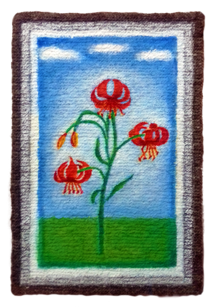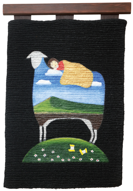 – Полотно я вяжу сама на обычных спицах, которыми носки вяжут. А в спицах – двухметровая леска. Самое большое полотно у меня шириной полтора метра и высотой 2,20. Вязка там нужна плотная. Пряжу покупаю готовую из среднеазиатской овцы. Эскиз обычно уже сам как-то в голове вертится. Я рисую его на ватмане точно такого же размера, как полотно, а потом вырезаю и использую как трафарет. Надо сделать все идеально, а то шерсть испортишь же. Обвожу мылом или мелом и потом уже начинаю грунтовать и рисовать. Рисую акриловыми красками.
