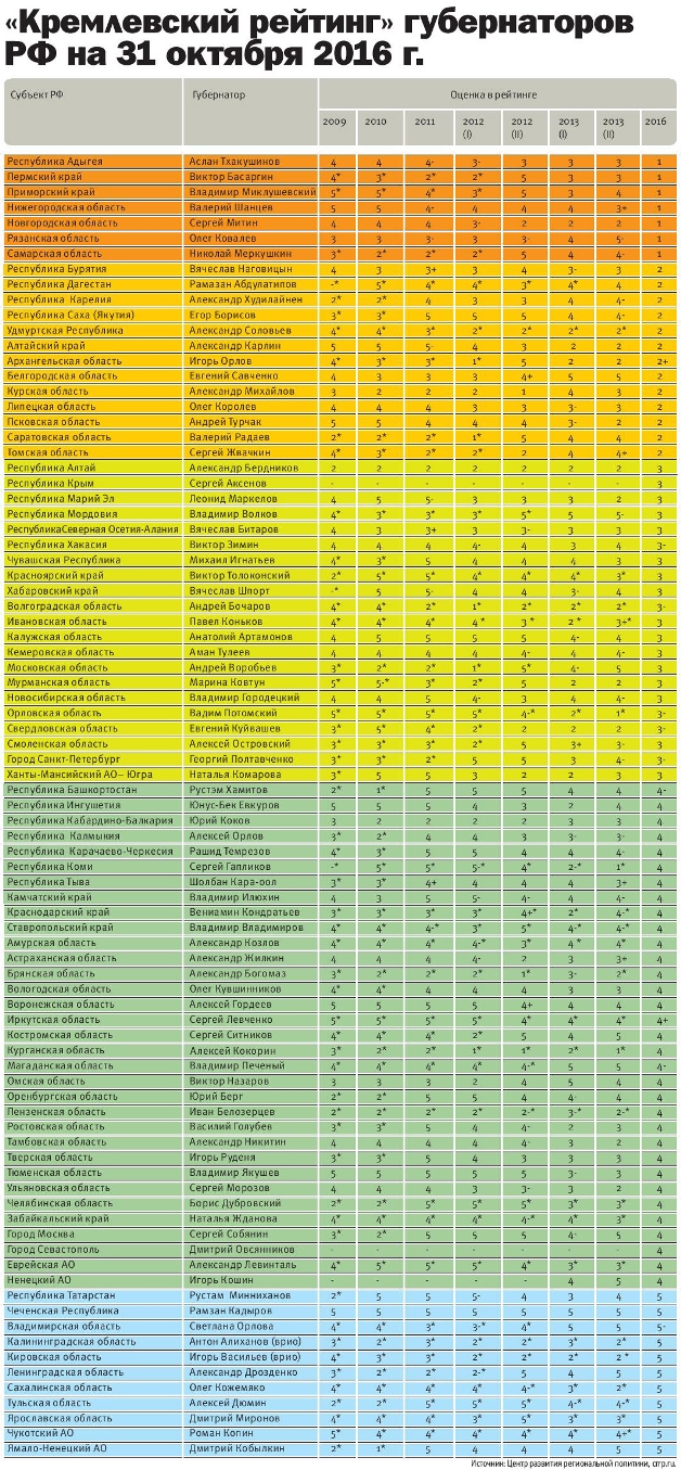 Оценка в рейтинге – сумма факторов, на основе которых прогнозируется вероятность отставки губернатора, усиления или ослабления позиций по отношению к федеральному центру, а не показатель эффективности его работы.