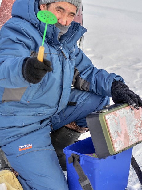 , подкармливал предполагаемых в лунках рыбок какой-то живой пищей (типа бормаша)