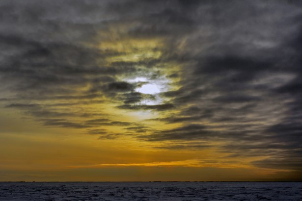 Сегодня я был одет в полный костюм рыбака (который как-то сумел прикупить в магазине неподалеку от дома), поэтому мороз мне был... Как это правильно говорится? Ну, вам это будет по пояс?(©) Подождав каких-то результатов от рыбалки некоторое время, я вспомнил про висящий на груди аппарат и решил не забывать запечатлевать что-то для истории. Тем паче вставал такой шикарный рассвет! Совершив несколько как бы тренировочных щелчков, я стал ожидать, когда солнце поднимется повыше и станет поболее размером. Пока прикидывал, какая точка съемки при этом будет самой удачной, я получил первый щелчок по носу. Солнышко сдулось и вместо поднятия вверх ушло вниз.