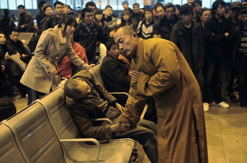 Монах рядом с пожилым человеком, который внезапно умер, ожидая поезда в Шаньси Тайюань, Китай