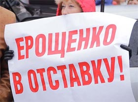 Главный лозунг акции - слова, которыми заканчивались выступления большинства ораторов, представителей коллективов или же инициативных групп населения – «Губернатора Иркутской области Сергея Ерощенко в отставку!»